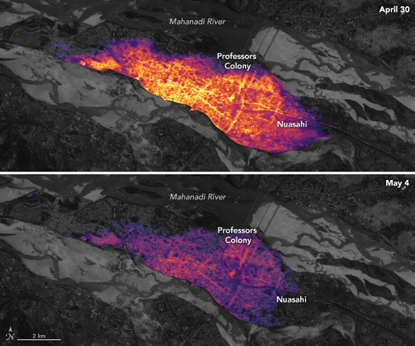 Éjszakai fények Cuttack városában, Odisha állam második legnagyobb településén – a ciklon előtt és után. (Kép: NASA EO / Lauren Dauphin / Ranjay Shrestha / NASA GSFC / USGS)