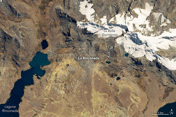 Az itt bemutatott képet az amerikai Landsat-8 földmegfigyelő műhold OLI (Operational Land Imager) kamerájának több hullámhosszon készített felvételeiből úgy állították össze, hogy a valóságosnak megfelelő színeket adja vissza. A város a kép közepe táján helyezkedik el, az Ananea nevű hegy oldalában, felette a La Bella Durmiente (avagy Csipkerózsika) nevű hatalmas gleccserrel.