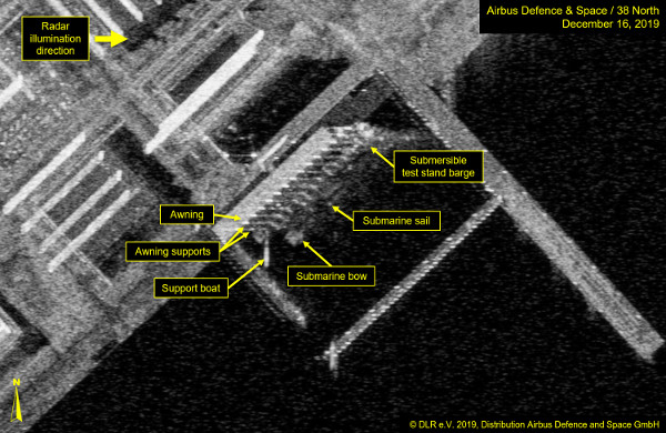 2020. január 1-jén egy törpe tengeralattjárót is láttak az elemzők. A kedvező látóirány miatt ezen a képen részben felfedezhető a nagyobb kísérleti tengeralattjáró is. (Kép: Planet Labs / 38 North)
