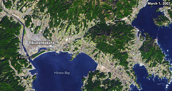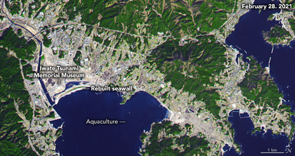 A NASA Terra műholdjának japán–amerikai ASTER sugárzásmérőjével Rikuzentakata városról és környékéről 2007. március 1-jén, 2011. március 14-én, azaz három nappal a katasztrófa után, és 2021. február 28-án készített felvételek. (Kép: NASA Earth Observatory, Joshua Stevens; adatok: NASA/METI/AIST/Japan Space Systems és U.S./Japan ASTER Science Team)