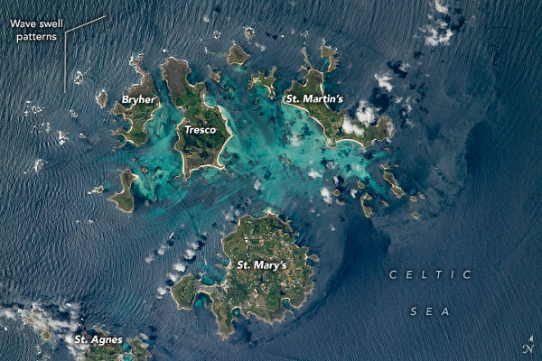 A Nemzetközi Űrállomás 65. állandó személyzetének egyik tagja 2021. június 8-án fényképezte le a Scilly-szigeteket. A szigetcsoport a Kelta-tengerben helyezkedik el – az Atlanti-óceánnak ezt a nyúlványát északon az Ír-sziget, keleten pedig a nagyobbik Brit-sziget délnyugati csücske és Bretagne határolja. A szigetcsoport Anglia legdélnyugatibb megyéjétől, Cornwalltól, pontosabban a Cornwall-félsziget csúcsától mintegy 45 kilométerre délnyugatra emelkedik ki a tenger vizéből. A szigetcsoport területe mindössze 16 km2, ezen osztozik az öt nagyobb sziget (St. Mary’s, Tresco, St. Martin’s, Bryher és St. Agnes) és a mintegy 140–150 apró, lakatlan gránitszikla. A szigetcsoport lakossága 2200 fő, akiknek a 80%-a a legnagyobb szigeten, St. Mary-n él. Fő bevételi forrásuk az idegenforgalom és a mezőgazdaság, azon belül a virágtermesztés.