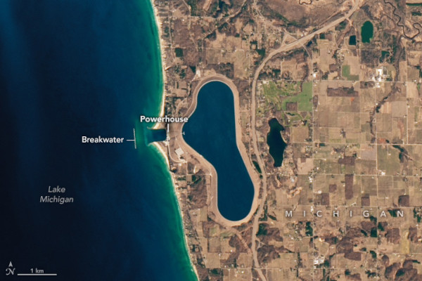 NASA Landsat–8 műholdja OLI kamerájának 2024. március 3-án készített felvétel a Michigan-tó keleti partján működő Ludington szivattyús-tározós erőműről. (Kép: NASA Earth Observatory, Wanmei Liang; Landsat adatok: U.S. Geological Survey)