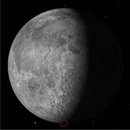 A Hold fázisa a becsapódáskor, illetve az esemény tervezett helye körrel megjelölve, a déli pólus közelében. (Kép: NASA)