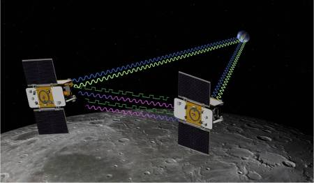 A GRAIL szondapáros (Apály és Dagály) működési elve. (Fantáziakép: NASA / JPL)