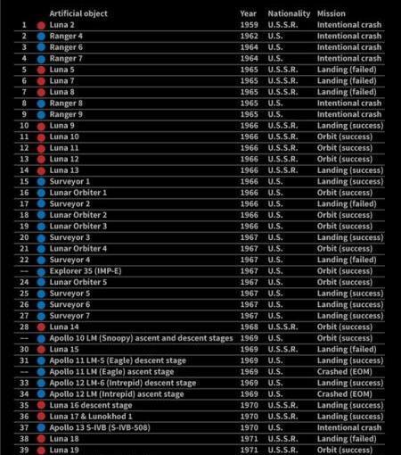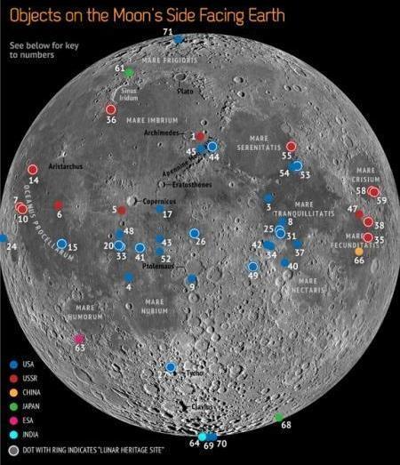 Jelmagyarázatként: a kék pontok amerikai, a pirosak szovjet eszközöket jelölnek. Ezeken kívül, 1990-től kezdve egy-két más készítésű (kínai – sárga, japán – zöld, európai – rózsaszín és indiai – türkiz) űrszonda maradványainak nyughelye látható a térképen. Felül a Hold innenső, a Földről megfigyelhető, alul a túlsó oldala látható. A fehérrel bekarikázott kék pöttyök a NASA számára védett emlékhelynek számítanak. A két holdi félteke térképe alatt olvasható a részletes lista az űreszközök neveivel, az évszámokkal és a felbocsátó országokkal vagy az Európai Űrügynökséggel (ESA).