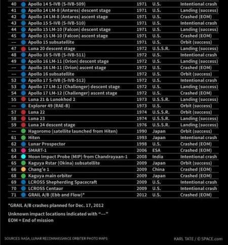 A Hold nem először (és persze nem utoljára) válik ember készítette űreszközök „lerakóhelyévé”. Az alábbi, a Space.com hírportálon megjelent ábra az égitest térképén bejelölve mutatja azt a 70 helyszínt, ahol 1959-től, a szovjet Luna-2-től kezdve valami – akár szándékosan, irányítva, a működési élettartam végén, akár véletlenül – becsapódott, vagy épp sima leszállás után ott maradt. Az automata űrszondák mellett megtalálhatók a listán az emberes Apollo űrhajók moduljai is. A 71-es sorszám a GRAIL szondák tervezett becsapódási helyét jelöli.