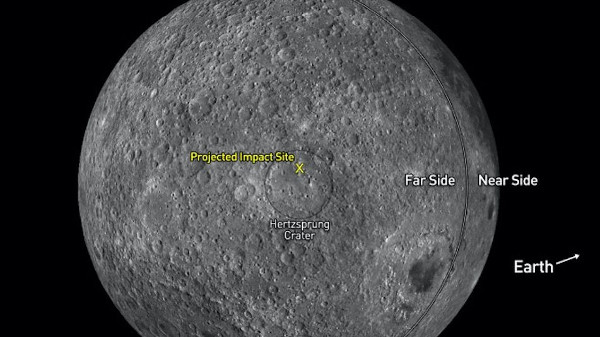 A becsapódás hozzávetőleges helye a Hold túloldalán, sárga kereszttel megjelölve. A NASA Lunar Reconnaissance Orbiter (LRO) szondája ugyan nem fogja tudni megfigyelni az eseményt, de az elkövetkező hetek vagy hónapok során készíthet nagyfelbontású felvételt a térségről, amelyen felismerhető lesz a frissen keletkezett kráter. (Kép: NASA / LROC / ASU / Scott Sutherland)