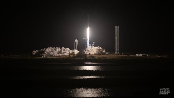 Ez alkalommal használta Falcon-9 rakétákkal a SpaceX kereken századik alkalommal a NASA Kennedy Űrközpontjának űrtörténelmi jelentőségű 39A starthelyét, ahonnan régebben az Apollo-expedíciók, majd űrrepülőgépes küldetések is indultak. A Falcon-9 rakéta ezúttal egy ötödször használt első fokozattal (B1085) repült. (Kép: Max evens / NSF)