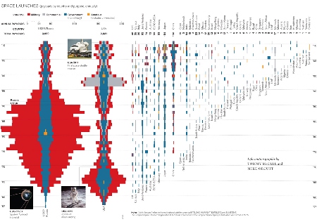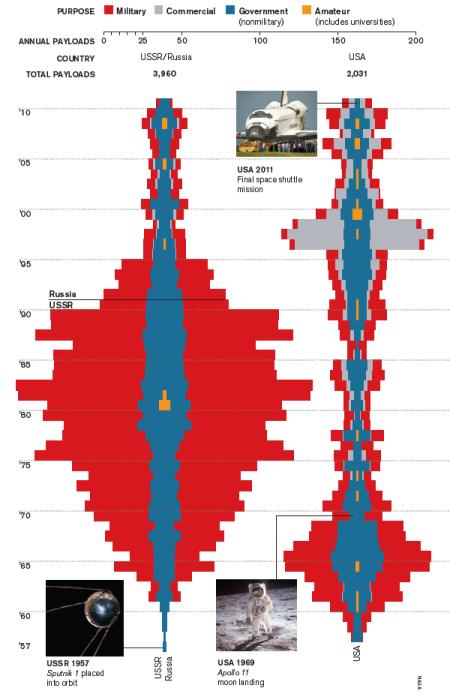 Az ábra adatait Jonathan McDowell (Harvard-Smithsonian Center for Astrophysics) gyűjtötte össze, a grafikai megjelenítés Tommy McCall és Mike Orcutt munkája. Az űrkorszak 1957-es kezdete óta egészen 2011 júliusáig szerepelnek rajta az űrindítások. Egy műhold, űrhajó, vagy a távolabbi Naprendszerbe indított űrszonda mind egy-egy pontnak számít. Az éves indítási számokkal arányos a színes oszlopok vízszintes kiterjedése. Az időtengelyen alulról felfelé növekednek az évszámok.