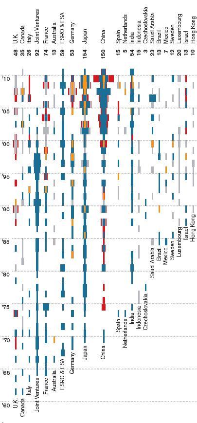 A színek négy különböző kategóriát jelölnek. Pirosak a katonai indítások, amelyek a hidegháború idején uralták a szovjet (és kisebb mértékben az amerikai) űrtevékenységet. Kékesszürkék a kereskedelmi, sötétkékek az egyéb kormányzati megrendelésre felbocsátott űreszközök. Végül narancssárga jelöli az „amatőr” műholdakat, beleértve az egyetemi készítésű, általában miniatűr méretű kutató űreszközöket is.