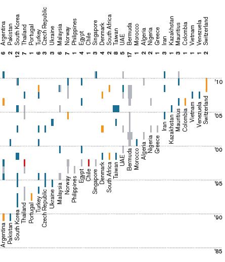 A felbocsátó országok (illetve nemzetközi szervezetek) balról jobbra olyan sorrendben szerepelnek, ahogyan az első startjukat végrehajtották. A bal oldalon tehát a Szovjetunió (1992-től Oroszország), mellette az Amerikai Egyesült Államok, majd az összes többi, valaha akár egyetlen műholdat felbocsátó állam, Svájcig bezárólag. Érdekességképp a legújabb szereplők közül megemlíthetünk olyan országokat, amelyekről nem közismert, hogy aktívak a világűrben: Mauritius 3, Kolumbia, Vietnam és Venezuela 1-1 űreszközzel.
