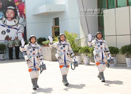 A három űrhajós a start előtt. Balról jobbra: Liu Jang, Csing Haj-peng és Liu Vang. (Kép: Kínai Védelmi Minisztérium)