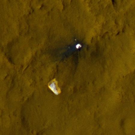 A Curiosity légköri leszállásakor használt ejtőernyője (balra lent) és védőborítása a Mars felszínén, az MRO felvételén. (Kép: NASA / JPL-Caltech / Univ. of Arizona)