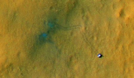 A Curiosity kelet-délkeleti irányba vezető keréknyomai jól látszanak felülről, a bolygó körül keringő Mars Reconnaissance Orbiter (MRO) szonda nagyfelbontású felvételein is. A rover légvonalban 82 m-re jutott a leszállóhelyétől. (Kép: NASA / JPL-Caltech / Univ. of Arizona)