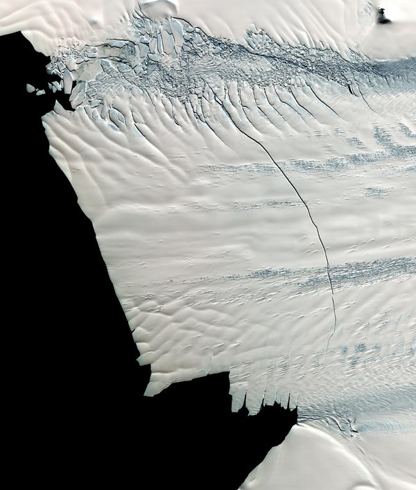 Hatalmas repedés az Antarktiszt borító jégtakaróban a déli szélesség 74,9 fokán a Nyugat-Antarktiszon (Pine Island-gleccser) 2011. október közepén. A repedés a képen 30 km hosszú, 80 méter széles és 60 méter mély. Két évvel később a repedés mentén leszakadt a gleccserről a B31 jelű, mintegy 600 km2 területű, 500 méter vastag jégsziget. (Kép: NASA / GSFC / METI / ERSDAC / JAROS / U.S./Japan ASTER Science Team)