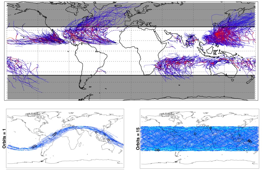 A CYGNSS műholdak a trópusi területek fölött repülve végzik méréseiket. A kép felső részén korábbi hurrikánok mozgását szemléltető görbéket rajzoltak a térképre. Alul balra az egy pályaperiódus (kb. másfél óra) alatt lefedhető területet mutatják. A jobb alsó térképről kiderül, hogy egy nap elteltével (15 pálya megtétele után) lényegében teljes lefedettséget tudnak biztosítani a nyolc CYGNSS holddal. (Kép: University of Michigan) Kapcsolódó cikkek: Kapcsolódó linkek: