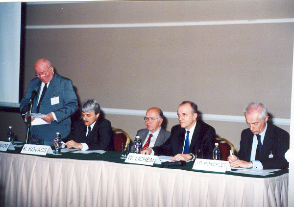 Pungor Ernő akadémikus, a magyar űrkutatás korábbi felügyelő minisztere, az EURISY tiszteletbeli tagja köszönti az EURISY 2004. május 27–28-i, budapesti konferenciájának résztvevőit. A képen tőle jobbra: Kovács Kálmán informatikai miniszter, a Magyar Űrkutatási Tanács elnöke, Almár Iván, az Űrkutatási Tudományos Tanács elnöke, Walther Lichem, az EURISY elnöke és Jean-Pol Poncelet, az ESA stratégiai igazgatója. (Kép: MŰI archívum)