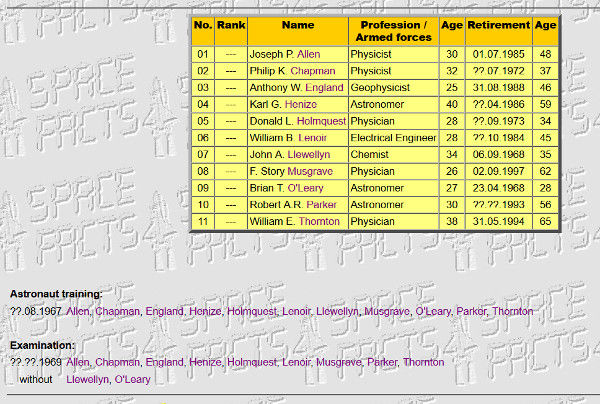 A NASA 6. csoportja. Jól látható, hogy a 11 jelöltből 9-en vizsgáztak, ketten nem. A 9 (vizsgázott) űrhajósból 7 jutott el a világűrbe, Chapman és Holmquest nem. (Kép: spacefacts.de)