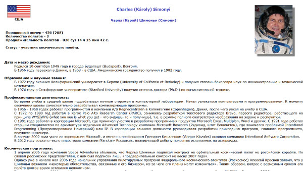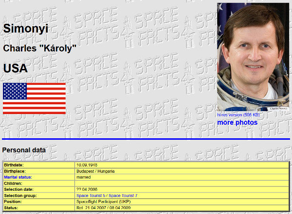 Charles Simonyi nyugati adatlapja (részlet). „Űrkukacoskodó” megjegyzés: az angol nyelvű adatlapon a szülőhaza megnevezése Hungary helyett Hungaria… (Kép: spacefacts.de)