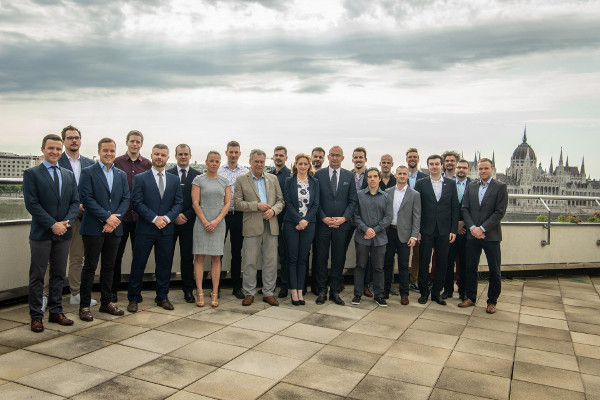 Csoportkép a HUNOR űrhajósjelöltjeivel, középen Farkas Bertalannal, Ferencz Orsolyával és Sztáray Péterrel. (Kép: kormany.hu)