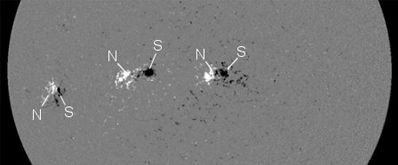 Három napfolt, a mágneses polaritás megjelölésével (N -északi, S - déli). Mindegyik a 23. ciklusra jellemző; az új ciklusban a polaritások felcserélődnek. (Kép: SOHO/MDI, ESA/NASA)