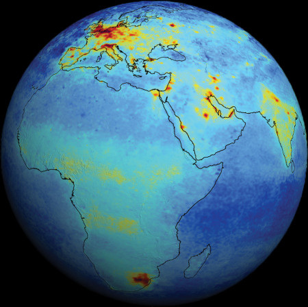 A nitrogén-dioxid átlagos koncentrációja a földi légkörben, az Envisat SCIAMACHY detektorának mérései alapján. (Kép: ESA)