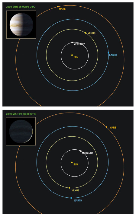 A Vénusz fázisai, valamint a belső bolygók és a Nap egymáshoz viszonyított helyzete a Vénusz két megfigyelése (2009. június 25., fent, és március 20., lent) alkalmával. Márciusban, közel az ún. alsó együttálláshoz, amikor a Vénuszból csak egy keskeny sarló (3,5%-os megvilágítottsággal) látszott, a bolygó tőlünk mért távolsága 43 millió km, míg júniusban 127 millió km volt. (Kép: ESA)