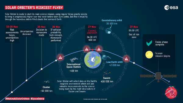 A Solar Orbiter mostani Föld-megközelítésének vázlata. A bolygóhoz legközelebb november 27-én, magyar idő szerint 5:30-kor lesz az űrszonda. A 460 km-es magasság összemérhető a Nemzetközi Űrállomás (ISS) 400 km körüli pályamagasságával. A legtöbb műhold alacsony Föld körüli pályákon (2000 km alatt) kering. Egy másik „népszerű” pályamagasság a geoszinkron műholdaké, kb. 36 ezer km-nél. (Kép: ESA)
