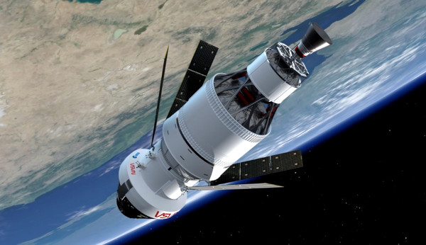 Az Orion űrhajó európai hajtóműves-műszaki egysége (ESM) a napelemekkel és a fő hajtóművel.