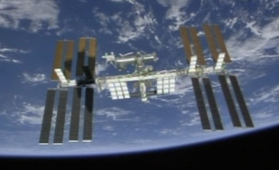 Az ISS, ahogyan a távozó Endeavour űrrepülőgépről látták, miközben tettek egy „búcsúkört” az űrállomás körül. (Kép: NASA TV)