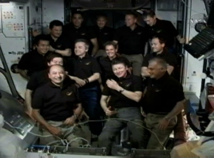 Még teljes a létszám: búcsúünnepség az STS-127 és az ISS 20. személyzetének részvételével. (Kép: NASA TV)