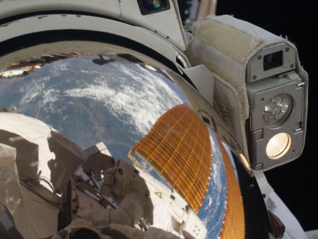 Érdekes felvétel a negyedik űrsétáról: Christopher Cassidy sisakján társa, Tom Marshburn tükörképe is látható. (Kép: NASA)
