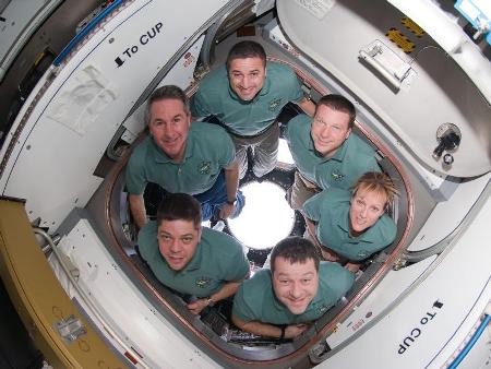 A hattagú személyzet még az űrállomás fedélzetén, a frissen felhelyezett Tranquility és Cupola egységek közötti átjáróban fényképezve.