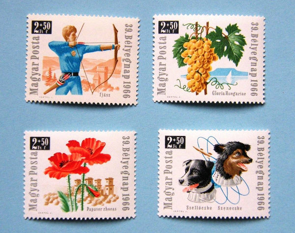 Az 1966-os Bélyegnapra jelent meg az űrhajós kutyákat ábrázoló magyar bélyeg (jobbra lent).