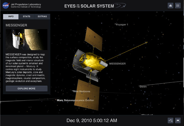 A programban 3D-ben forgathatjuk, nagyíthatjuk a Naprendszert, bolygóit, holdjait, és ez mind semmi, megtalálhatjuk az űrben épp küldetésükre igyekvő szondákat, amelyeket ugyancsak 3D-ben forgathatunk, nagyíthatunk vizsgálhatunk meg közelebbről. Ide kattintva indul a varázslat.