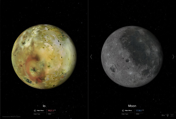 Az Io és a Hold összehasonlítása. (Kép: NASA Eyes)