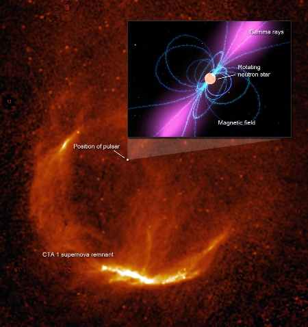 A Fermi-űrtávcsővel felfedezett első, csak a gamma-tartományban sugárzó pulzár (fantáziakép a betétábrán) a Cepheus csillagkép irányában látszó, 4600 fényév távolságban levő CTA 1 szupernóva-maradvány belsejében. A CTA 1 képe 21 cm-es rádióhullámhosszon készült. (Kép: NASA / S. Pineault, DRAO)
