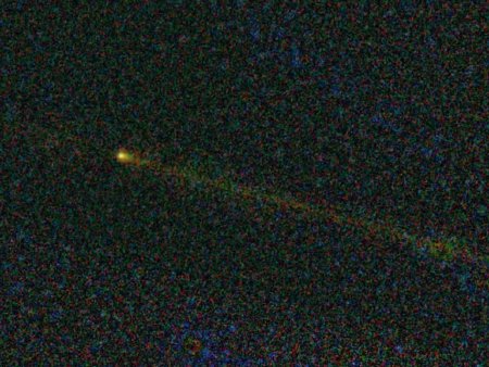 Fent a WISE 4.6, 12 és 22 μm-es hullámhosszú felvételeinek kombinálásával még május 10-én készült hamis színezésű kép látható a Hartley-2 üstükösről. A hivatalos nevén 103P/Hartley mindössze 1986 óta ismert, nevét ausztrál felfedezőjéről kapta. Különös érdekessége, hogy a NASA EPOXI küldetése keretében (vagyis a korábbi Deep Impact űrszonda második üstökös-célpontjaként) november elején közeli információkat is kaphatunk majd róla. A 6,46 éves periódusú, a Naphoz épp egyre közelebb kerülő üstükös október 28-án éri el pályája napközeli pontját, az űrszonda pedig november 4-én közelíti majd meg. A WISE mérései segítenek az EPOXI kutatócsoportjának az égitest tulajdonságainak minél részletesebb számba vételéhez. Az infravörös képen az üstükös porcsóvája mintegy 1,8 millió km-en át látható. Összehasonlításul: maga az üstökösmag, ahonnan a csóva anyaga származik a becslések szerint mindössze 1,2 km átmérőjű. A kép foltos háttere zaj, a látómezőben levő csillagok nyomát a feldolgozás (több különböző felvétel kombinálása) során eltávolították.