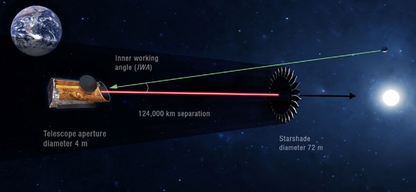 A HabEx 4 méter átmérőjű távcső lenne, amelytől 124 ezer kilométerre helyezkedne el a 72 méter átmérőjű csillagárnyékoló korong. Ennek köszönhetően közvetlenül megfigyelhetővé válnak az exobolygók. (Kép: NASA)