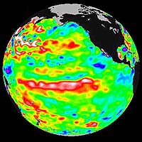 Egyik ábránknak talán azt a címet adhatnánk, hogy "a következő El Ninóra várva". A képen a TOPEX/Poseidon tengerfelszín magassági adataiból szerkesztett térkép látható, egy augusztus 7-én véget ért, tíznapos adatgyűjtési ciklusnak köszönhetően. A tengerfelszín magassága tulajdonképpen igen plasztikus rajzolata a tengerben felhalmozódott melegebb víztömegeknek. Természetesen ilyen hihetetlen méretű extra-hőmennyiségnek óriási hatása lesz a Föld klímájára, ezért nyomon követése igen fontos, enélkül ugyanis lehetetlen a nagyléptékű, globális időjárás-előrejelzés. Jól látszik, hogy az itt vörössel megjelenített víztömeg hogyan áll össze a Csendes-óceánban. 2001 májusa óta például több hasonló meleghullám indult el keleti irányba, melyek mintegy két hónap alatt keresztezték a Csendes-óceán egyenlítői térségét. Egy különösen nagy "meleg víztömeg" például februárban érte el Dél-Amerika partjait, 2 fokkal megemelve ott a vízhőmérsékletet, és kiváltva a NOAA (amerikai óceánkutató és légköri hivatal) El Nino-riasztását. A képen látható meleg víztömeg júniusban indult útjára és jelenleg is közeledik Dél-Amerikához, naponta 215 kilométerrel kerülve közelebb a partvonalhoz! Másik ábránk a TOPEX/Poseidon holdat ábrázolja.