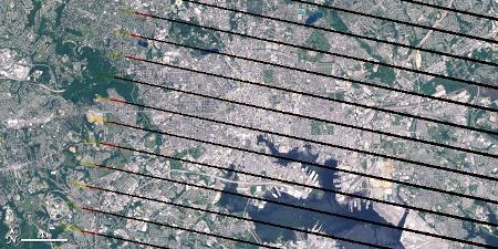 Baltimore, Maryland állam, USA. A Landsat-7 felvételen a hiányzó sávokat fekete csíkok jelzik.