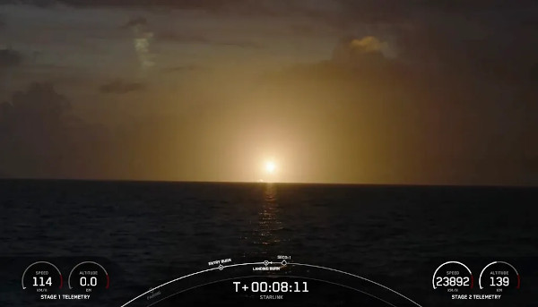 A Starlink 10-12 jelű küldetés 23 darab műholdját szállító Falcon-9 rakéta első fokozatát (B1080, 16. repülés) a Bahama-szigetek közelében állomásozó úszó platformra hozták vissza. (Kép: SpaceX)