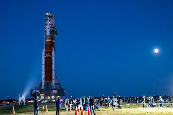 Emlékezetes pillanat: március 17-én először jelent meg a szabad ég alatt, a meghívott ünneplő közönség szeme láttára az összeszerelt SLS–Orion rendszer a NASA floridai Kennedy Űrközpontjában. Jobbra a majdani célpont, a Hold is a fényképre került. (Kép: ESA / A. Conigli)