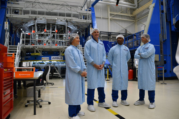 És ha már Artemis, akkor folytassuk Artemisszel. Szeptember közepén (azaz a fenti aláírásokkal egyidőben) az első személyzetes Artemis/Orion űrrepülés négy fős kijelölt személyzete Brémában járt. Az Airbus ottani üzemében készült ugyanis az Artemis-2 holdkerülő expedíció Orion űrhajójának műszaki-hajtóműegysége. Az ESM-1 (European Service Module) repült automatikus üzemmódban, az ESM-2 pedig már az Egyesült Államokban van, azzal fog utazni a az alábbi képünkön látható kvartett. Miután a négy űrhajós végzi el az Orion igazi berepülését, fontos, hogy nagyon részletesen ismerjék meg űrjárművüket. Ezúttal az ESM építésével való ismerkedésen volt a sor, hisz ez a blokk szolgáltatja a levegőt, vizet, elektromos áramot, a meghajtást, és biztosítja a kabin megfelelő hőmérsékletét is. A négy asztronautának lehetősége volt különböző építési fázisban lévő ESM-eket tanulmányozni. Az ESM-3 (az első Artemis holdraszállás műszaki blokkja) már rendelkezik hajtóanyagtartállyal, és hamarosan elindítják az USA-ba. Az ESM-4-en (melyen először fog európai űrhajós utazni, hogy eljusson a Hold körül keringő I-Hab Gateway modulhoz) jelenleg kábelezési, vezetékezési, csőbehúzási munkák folynak. Az ESM-5 és -6 már szintén Brémában van. Az előbbin épp csak megkezdték a munkákat, míg az utóbbi csak a közelmúltban érkezett.