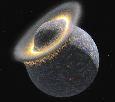 A becsapódáskor kidobott anyag fánk alakban vette körül a Földet, ebből tömörülhetett össze a Hold. (Fantáziarajz: Sarah Stewart)
