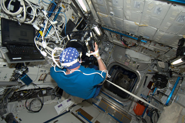 André Kuipers saját agyműködését vizsgálja a részben magyar tervezésű Neurospat kísérletben az ISS fedélzetén (2012). (Kép: ESA / NASA)