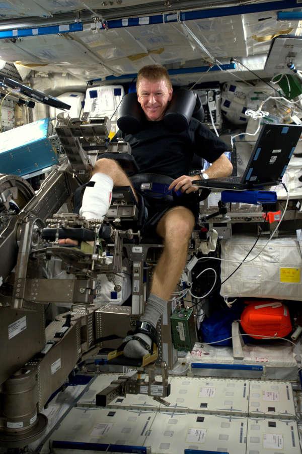 Tim Peake brit űrhajós az izmai tömegének változását vizsgálja űrrepülése ötödik hónapjában (2016. április 29.). (Kép: ESA / NASA)