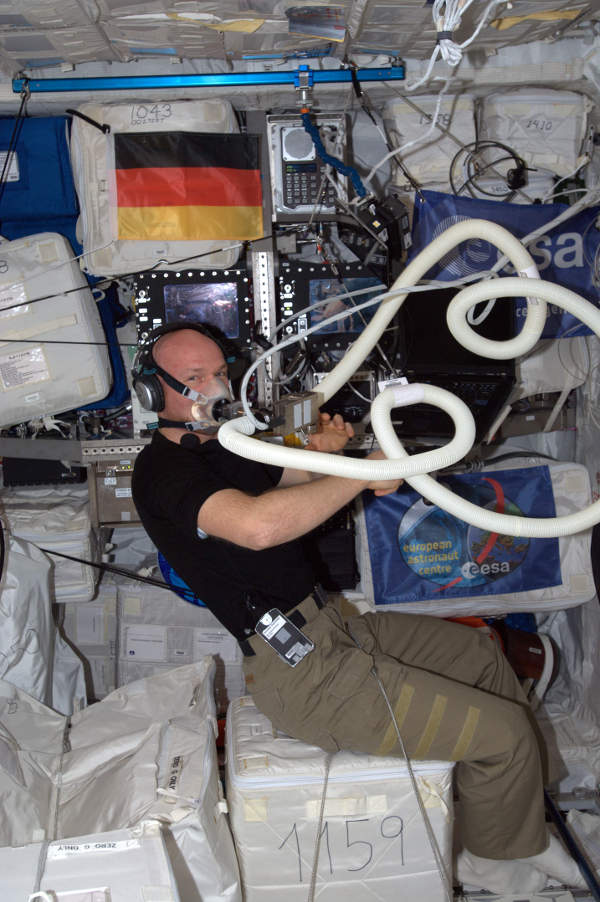 A kísérletsorozat egyik korábbi alanya Alexander Gerst német ESA-űrhajós volt. Az űrhajós több órán keresztül a csövön keresztül lélegzik, így pontosan mérhető, mennyi oxigént használ fel a szervezete munka közben. (Kép: ESA / NASA)