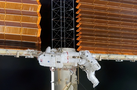 A napelemet korábban földi parancsokkal csak félig sikerült összehajtani. A képen Sunita Williams és Robert Curbeam előző próbálkozása látható, amelynek során az eredmény kb. 65%-os lett. A mostani utolsó űrséta során sikerült az STS-116 utolsó jelentős űrállomás-építési feladatával is végezni. (Kép: NASA)