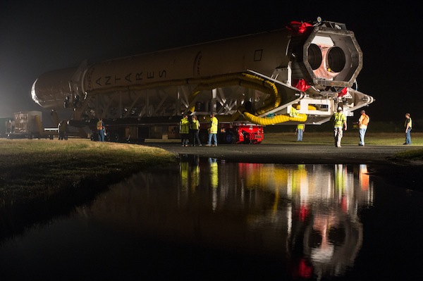 Az Antares rakéta, tetején az orrkúpja alá helyezett Cygnus teherűrhajóval, útban a 0A jelű startállás felé. (Kép: NASA / Aubrey Gemignani)